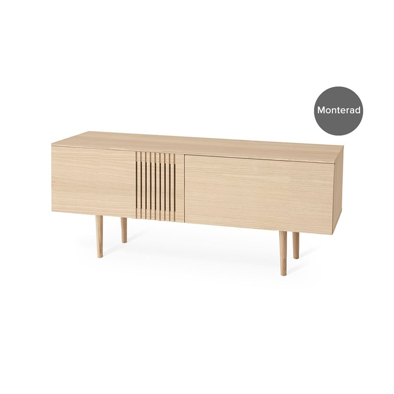 Mediebenk B 120 D 39 H 50 cm. Mediebenk i finert hvitoljet eik med to dører og en trehylle bak hver. Dreide ben er inkludert, men benken kan monteres på veggen som et alternativ.