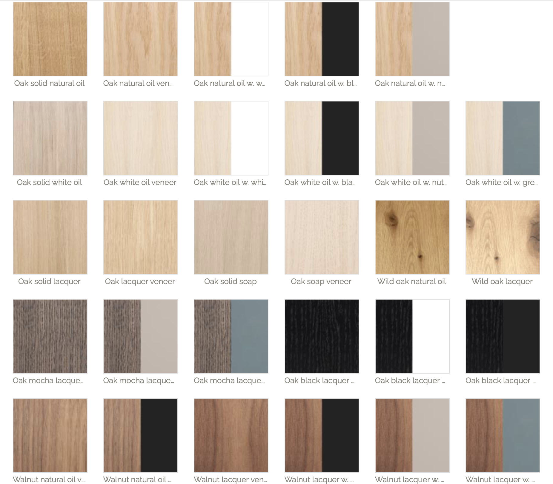 Eik heltre naturoljet (EMO), Eik naturoljet finér (EO), Eik naturoljet understell med hvit laminat topp, Eik naturoljet understell med svart nanolaminat topp, Eik naturoljet understell med muskat nanolaminat topp, Eik heltre hvitoljet (EMH), Eik hvitoljet finér, Eik hvitoljet understell med hvit laminat, Eik hvitoljet understell med svart nanolaminat, Eik hvitoljet understell med muskat nanolaminat, Eik hvitoljet understell med grønn nanolaminat, Eik heltre lakkert, Eik lakkert finér, Eik heltre såpebehandlet, Eik såpebehandlet finér, Villeik naturoljet, Villeik lakkert, Eik mokkalakkert finér, Eik mokkalakkert understell med muskat nanolaminat, Eik mokkalakkert understell med grønn nanolaminat, Eik svartlakkert finér (wengé), Eik svartlakkert understell med hvit laminat, Eik svartlakkert understell med svart nanolaminat, Valnøtt naturoljet finér, Valnøtt naturoljet understell med svart nanolaminat, Valnøtt lakkert finér, Valnøtt lakkert understell med svart nanolaminat, Valnøtt lakkert understell med muskat nanolaminat, Valnøtt lakkert understell med grønn nanolaminat, Bøk heltre lakkert, Bøk lakkert finér, Bøk heltre såpebehandlet, Bøk såpebehandlet finér
