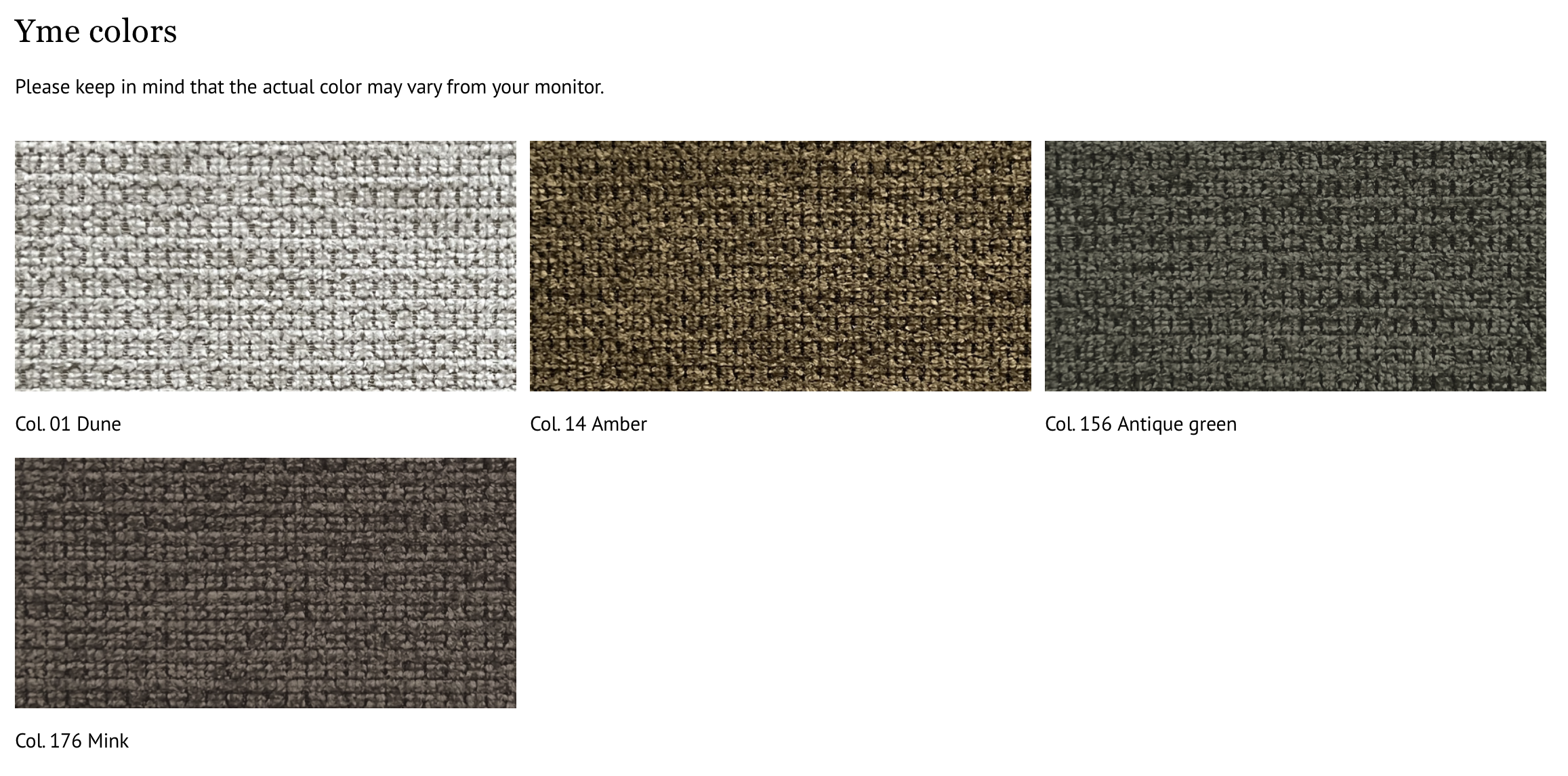 | Velg farge | 1. Natur (01 Dune), 2. Okergul (14 Amber), 3. Grønn (156 Antique green), 4. Varm mørk grå (176 Mink) |